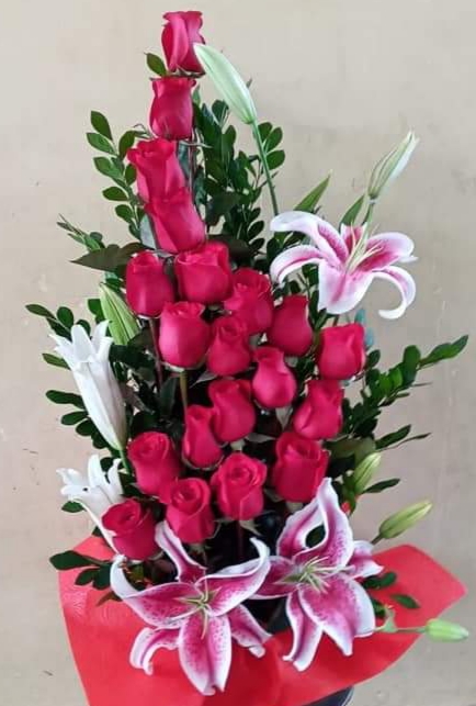 Arreglo de 24 rosas nacionales + lilium + follaje a 90 soles,