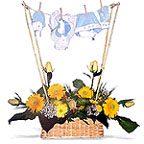 Tonos amarillos costo 110 soles flores que lleva el arreglo 12 Rosas amarillas importadas Margaritas o Gerbera Astromelia Liliums, Follajes finos y tendedero con ropas para niño.