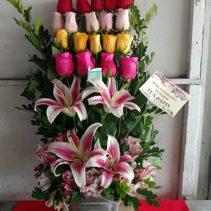 Arreglo con rosas importadas + lilium + follaje a 150 soles, comunicarse al 993182663, 993182746 para verificar stock, horario de atencion 9am a 7pm, envio por delivery 9am a 7pm