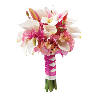Bouquet de Calas finas y hortensias, acompañadas de fino follaje de novia. Incluye cinta de Organza.
