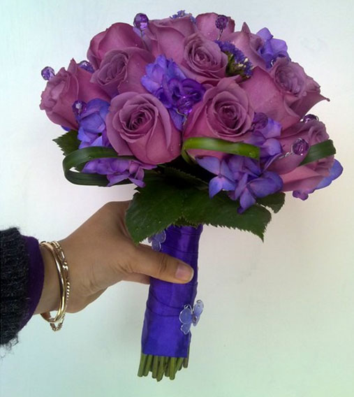Bouquet rosas moradas con aplicaciones de hortensias moradas y follajes
