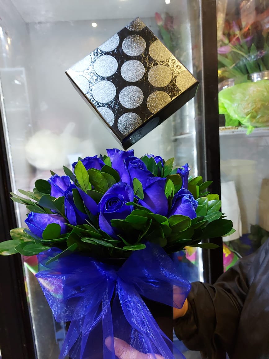 box con 18 rosas azules y follajes los colores pueden variar de acuerdo al gusto del cliente comunicarse al whatsapp 993182828/993182746