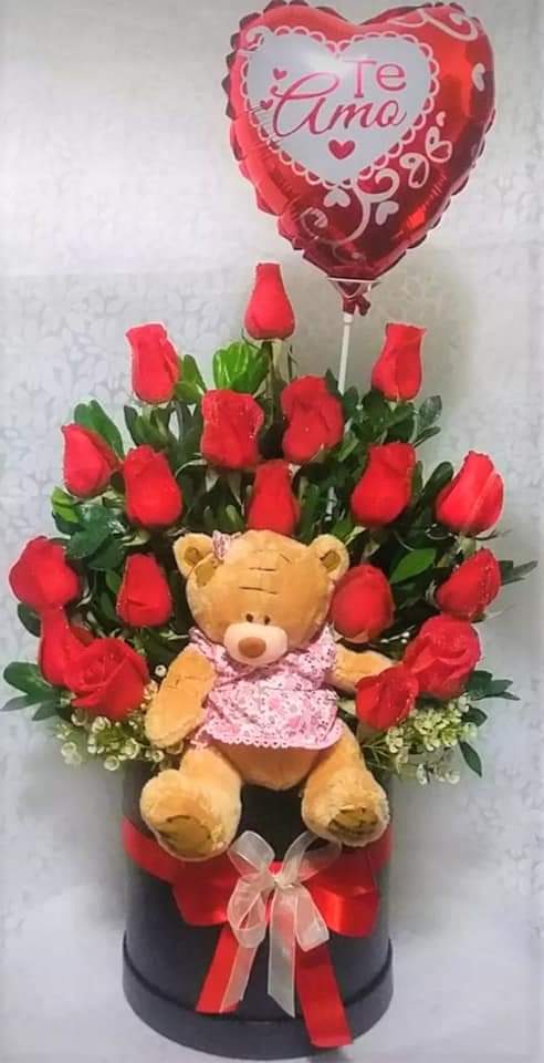 Box con 20 rosas+peluche mediano+follaje+globo colores variados comunicarse al