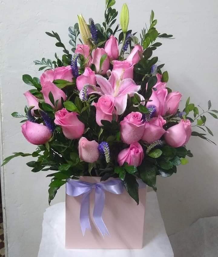 box con 18 rosas ,liliums y follajes colores variados comunicarse al whatsapp 993182746/993182828