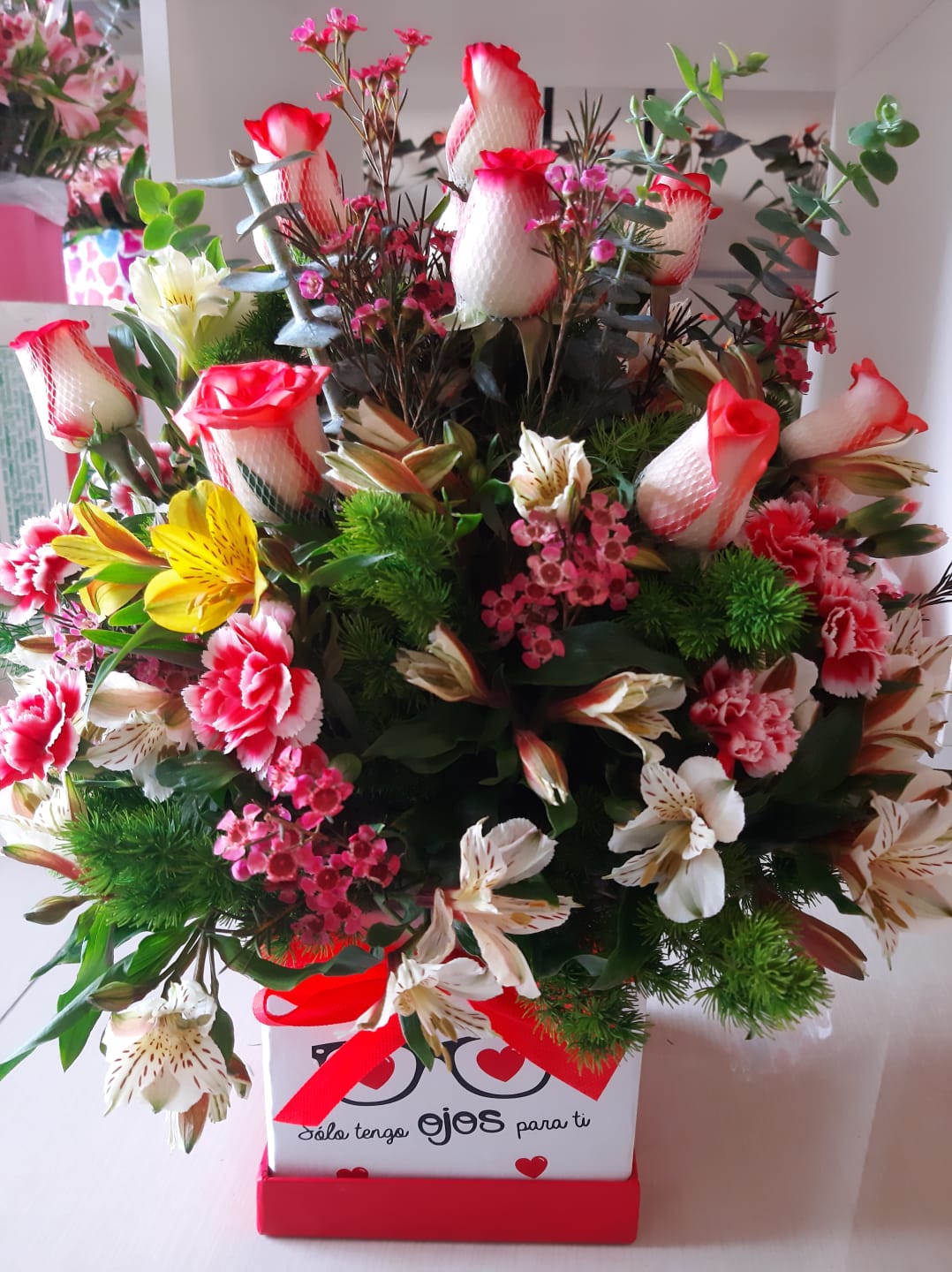Box con rosas importadas + follaje a 120 soles comunicarse al 993182828, 993182746 para verificar stock, horario de atencion 9am a 7pm, delivery 9am a 7pm