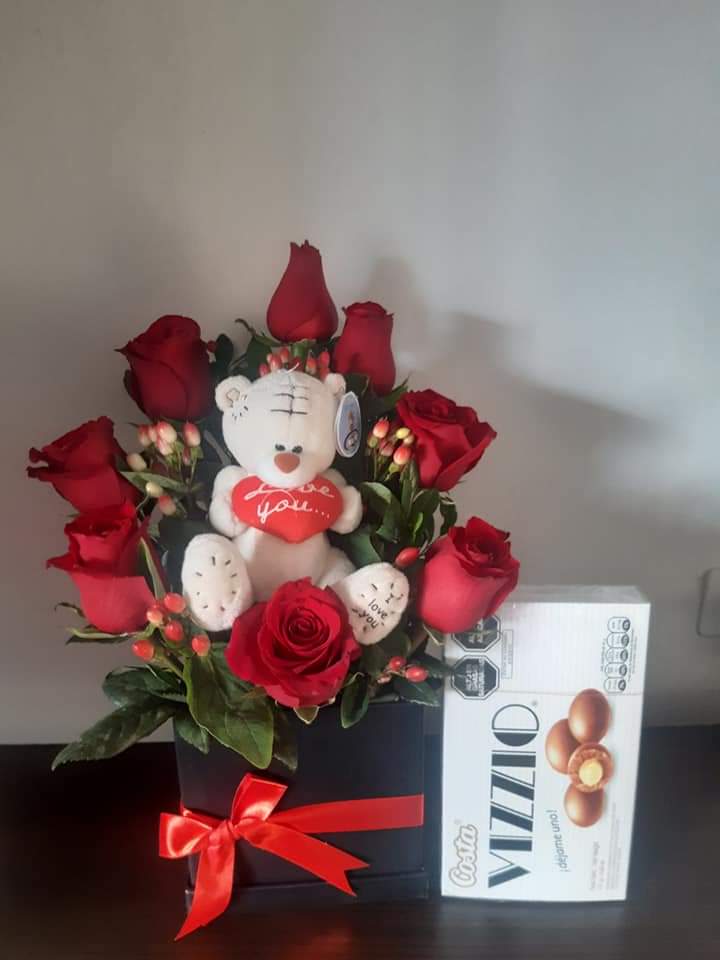 Box de 8 rosas importadas + peluche + Chocolate Vizzio comunicarse al 993182746, 993182828 para verificar stock, horario de atencion de 9am a 7pm, envio por delivery 9am a 7pm