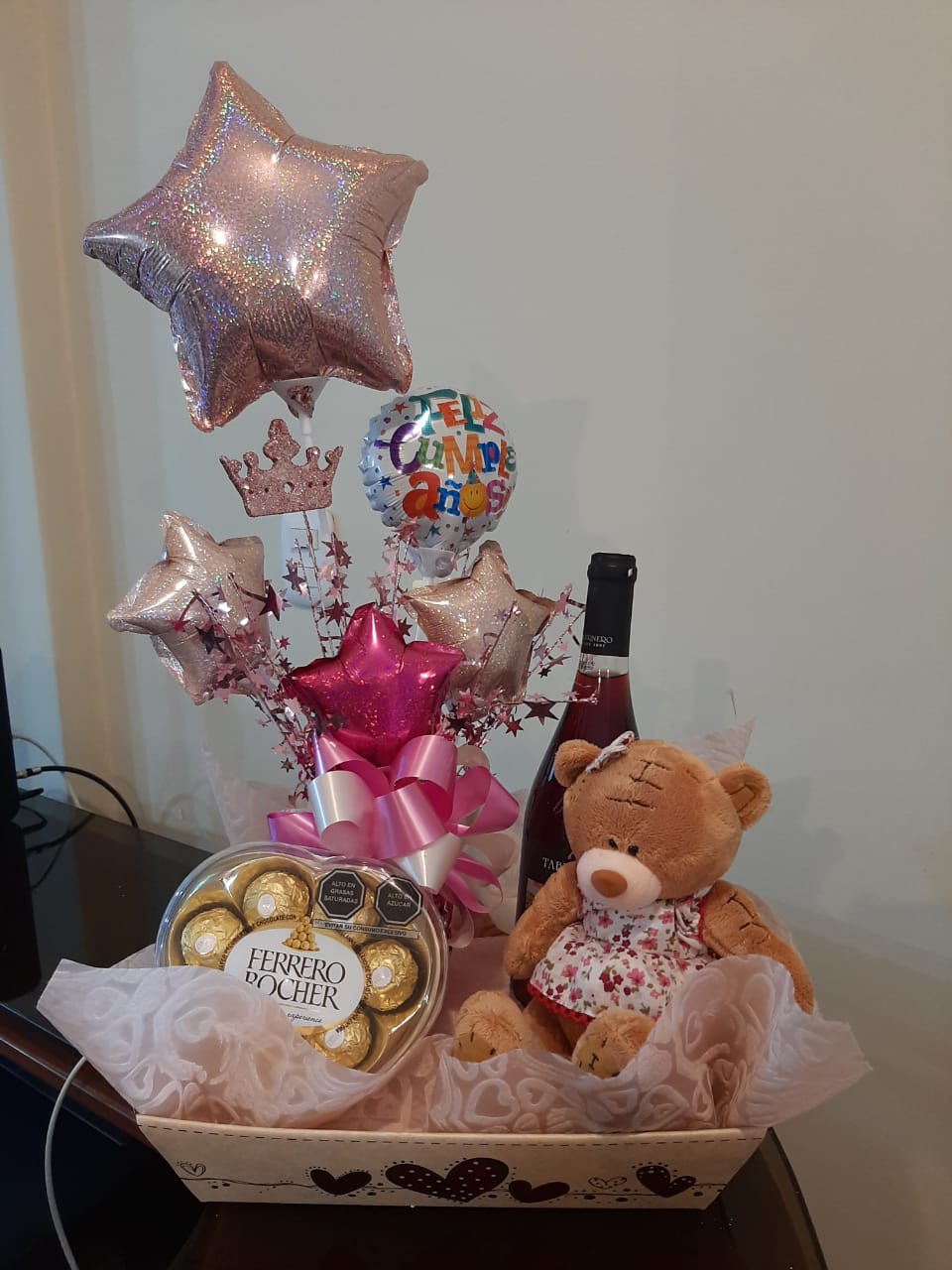 Caja con vino Tabernero+ turrones+chocolatets +globos +tarjeta +peluche comunicarse solo por whatsapp al 993182663