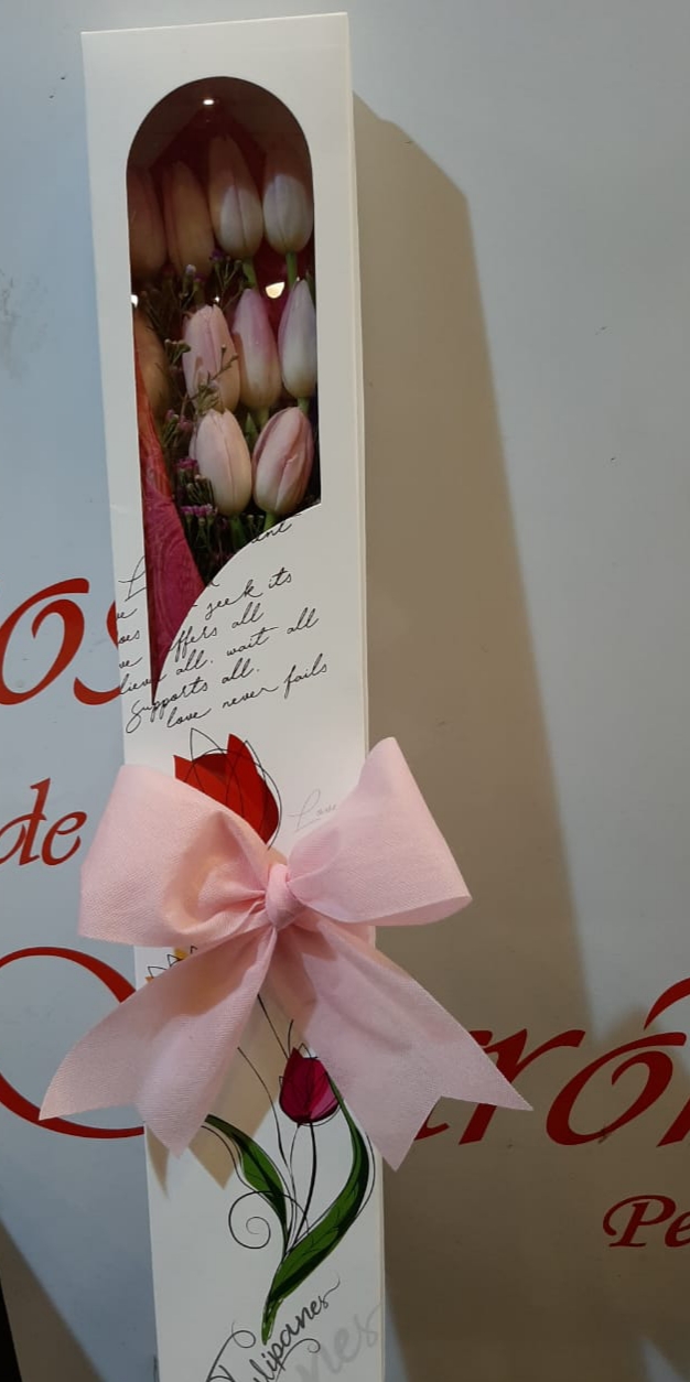 Caja con 12 unidades de tulipanes en diferentes tonos costo 130 soles comunicarse al whatsapp 993182828