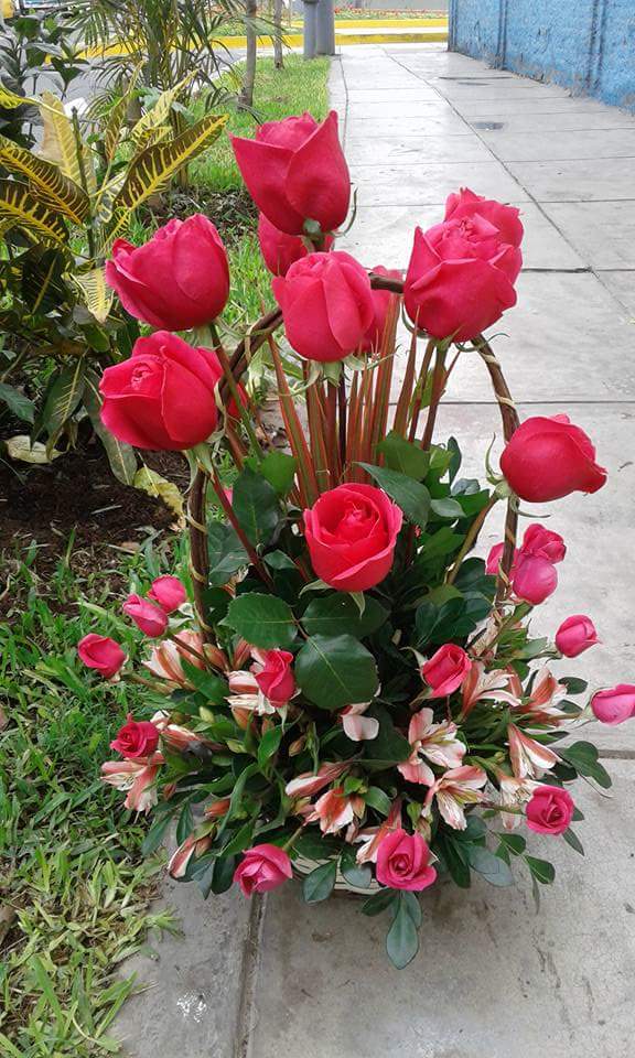 canasta combinadas con rosas grandes y pequeñas de vivero y acompañados de follajes