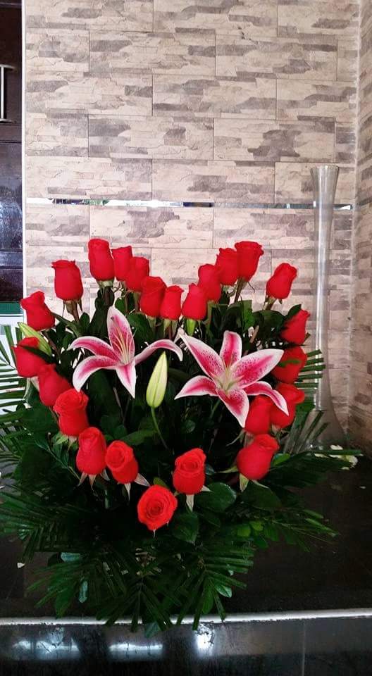 corazón de rosas rojas y 1 liliums rosado en el centro los corazones pueden ser el color que a usted mas le gusta con rosas colores variados rosados, rojos,naranjas ,amarillos,morados,lilas o blancos a eleccion del cliente llamar al 2634648 o al 993182663 para ver el stop del producto y el color a preparar horario de atencion es 9am -8pm envios desde las 9am hasta las 7pm depositar a la cuenta y mandar el vaucher por whatsapp,la direccion dedicatoria y nombre de la persona a entregar.