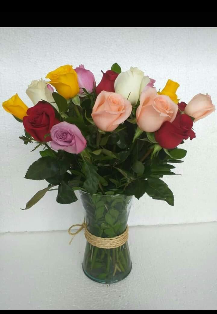 florero con 12 rosas de colores + follaje 90 soles comunicarse solo por whatsapp al 993182 828 /993182746