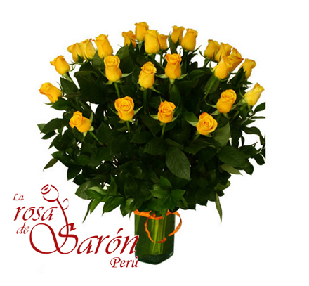 Hermoso florero que contiene 25 rosas importadas amarillas. Incluye florero, follaje y tarjeta dedicatoria.