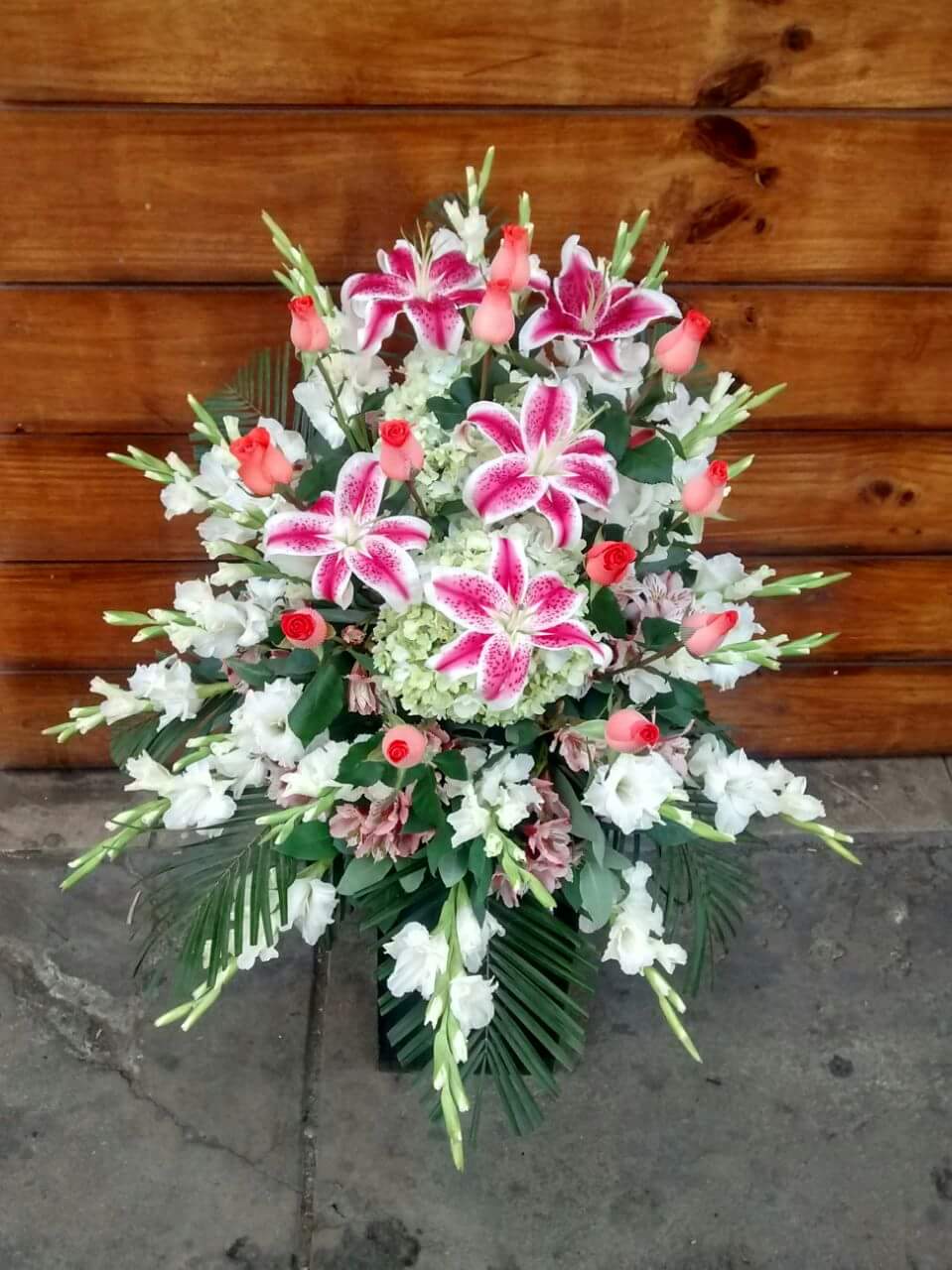 lagrima estilo manto elaborado con gladiolo blancos y liliums y aplicaciones de astromelias ideal para la parte de encima del cajon y a los pies del cajon .Puede ser elaborado en cualquier color como naranjas morados ,amarillos y blancos.