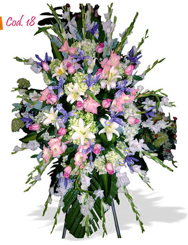 Manto con pie gladiolo dos colores iris rosas azucenas hortensias y follajes