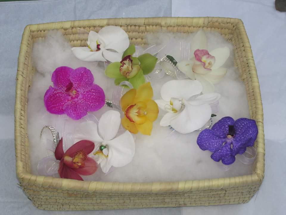 orquideas phalaenopsis cada flor decorada con follaje y presentada en una cajita transparente y lazo de organza consultar por los colores teñidos
