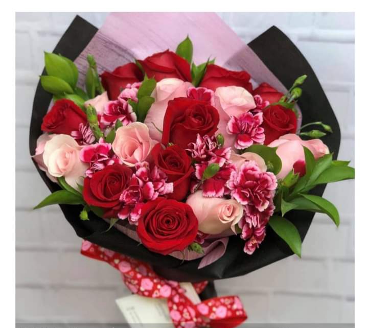 - Ramo de rosas 24 multicolores importadas + claveles + follaje + envoltura especial a 200 soles